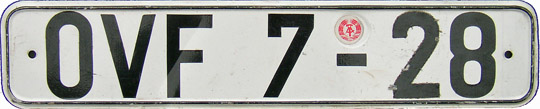 This plate belongs to same series and design as above, but with three letters as introduced in 1976. Red seal was used from 1987. This plate is issued in town Suhl in bezirk Suhl. After GDR ceased to exist in 1990 their plates were valid until end 1992. |